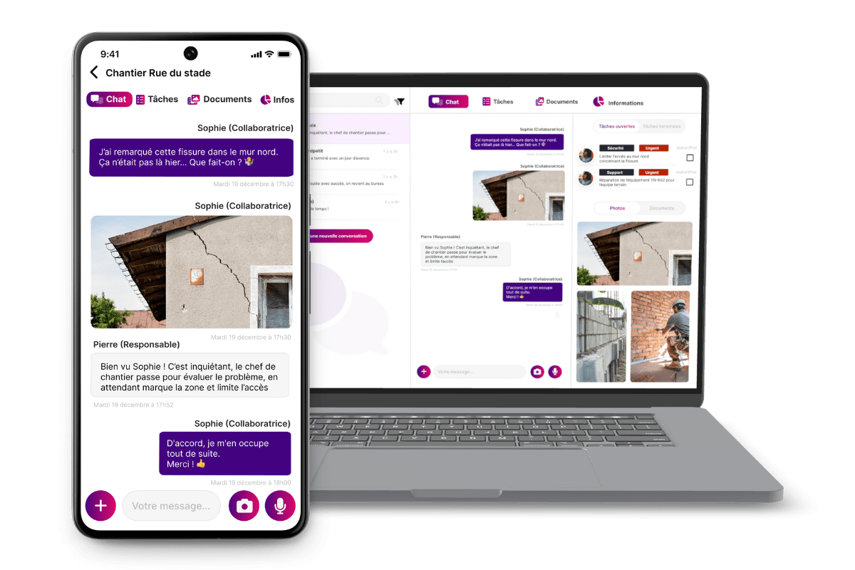 Échange des photos, des messages sur le fil d’actualité dédié à ton chantier et accède aux tâches et infos pratiques plus facilement.